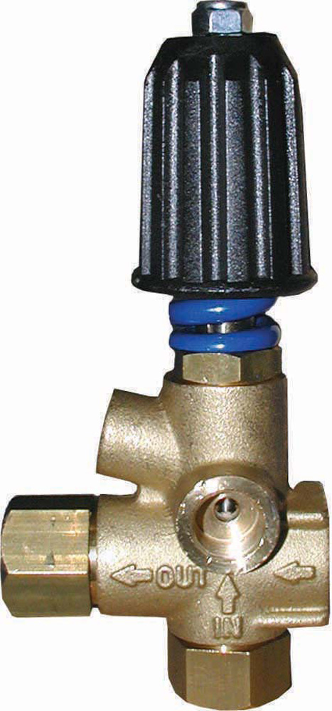 Pressure type Unloader Valves. (Also referred to as Trapped Pressure Unloaders)Most pressure washers use this type of unloader valve. It is the least complicated to use. This valve responds to the amount of pressure exerted on the by-pass valve. The unloader uses a seat, ball, and spring. These components control the flow of water into the by-pass port. When the operator has the trigger gun open, the water flows from the unloader inlet port to the outlet port, with only a small amount being by-passed. When the trigger gun is closed, the pressure increases as the pump continues to push water out. When the pressure becomes greater than the resistance of the spring, the ball moves off the seat and allows the water to go through the by-pass port. The by-pass valve opening is aided by a check valve in the outlet port that quickly diverts the water flow to the ball and seat of the unloader. The check valve in the outlet also traps the pressure in the hose giving the characteristic pop of pressure when the trigger gun is opened that is associated with a pressure type unloader. An adjustment knob or bolt allows adjustment of the springs tension on the ball by either compressing the spring down to create more resistance, or expanding the spring, thereby causing it to exert less pressure on the ball. When the spring is adjusted to create the maximum outlet pressure, little water enters the by-pass port. When the spring is expanded, lower water pressure can push the ball out of the way, thus allowing more water to by-pass even when the trigger gun is open. This reduces the flow of water to the gun, and of course the nozzle. Less water being forced through the nozzle reduces the pressure at the nozzle. Here are some advantages. Pressure type unloaders are less sensitive to flow restrictions than flow type unloaders. This allows various orifice sizes to be used without cycling problems. Rebuilding kits are usually very simple and inexpensive, providing the ball, spring, and seals or gaskets. A disadvantage to this type of unloader is the trapped pressure that creates the pop of pressure when the gun is opened. It can be dangerous when the operator is working from a ladder; it also spikes the pressure within the equipment.
